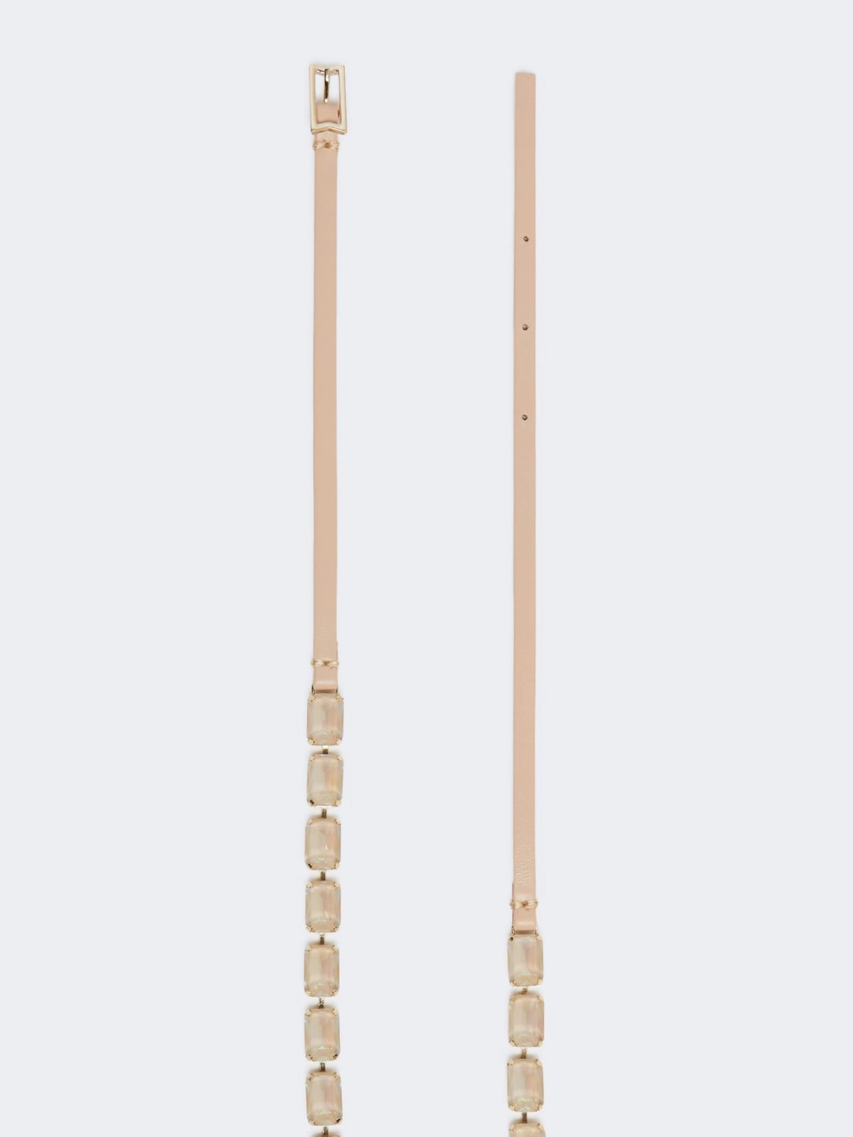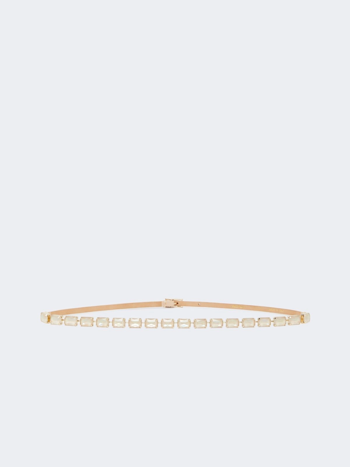 Jewel belt with ornate detail on the front composed of metal and glass elements.