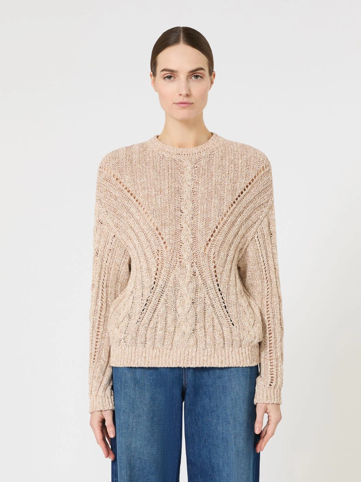 Crew neck jumper featuring a mix of cable stitch, ribbed knit and slanted openwork details.