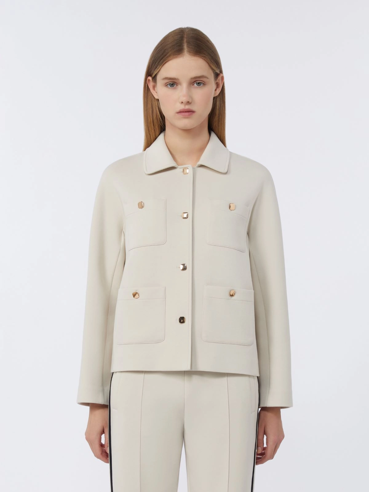 Cropped jacket featuring four patch pockets with metallic buttons on the front.